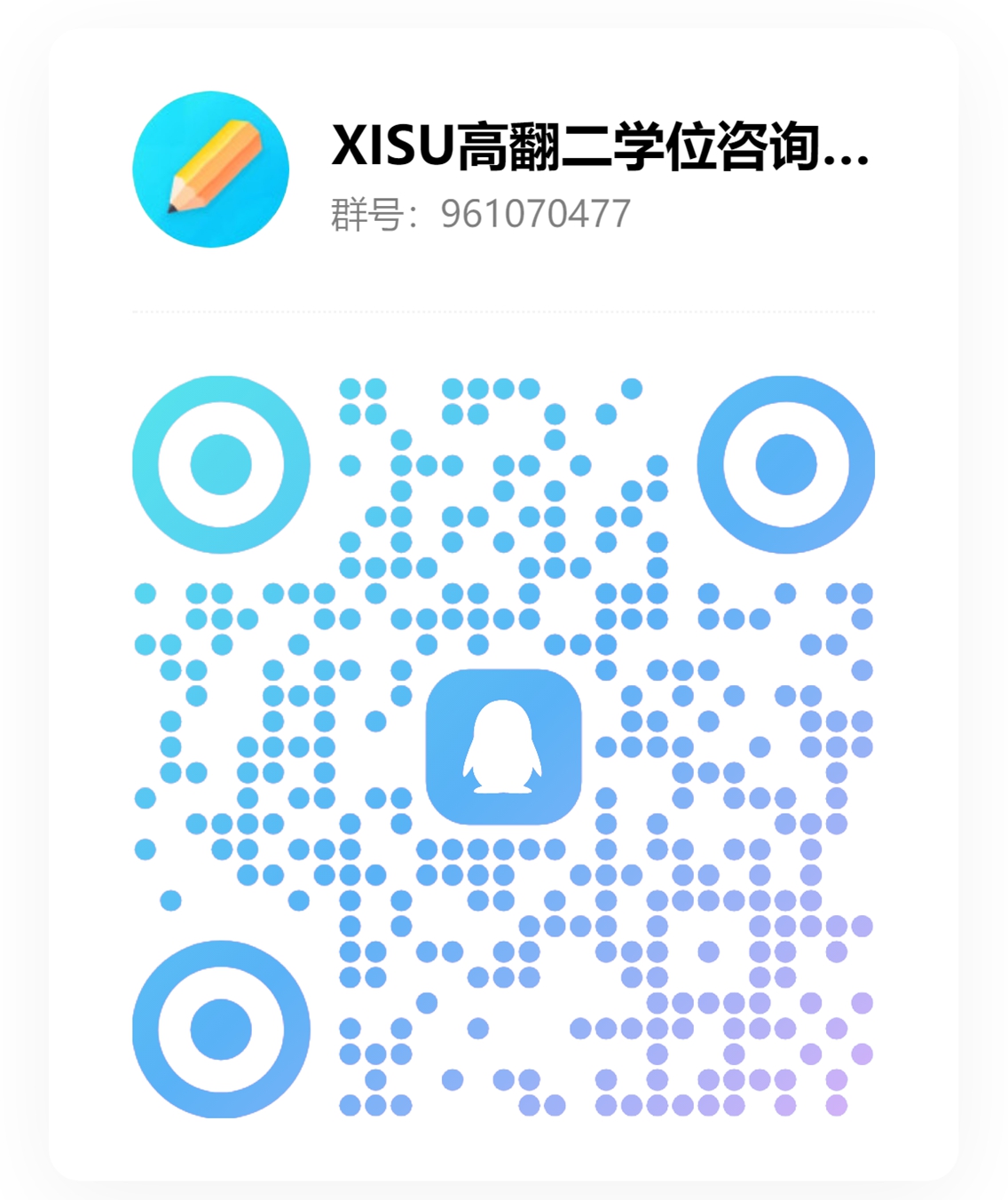 考生可加入QQ“西外翻译专业第二学士学位招生考核信息交流群”,群号:961070477(二维码见下方), 考核详细安排见群通知。