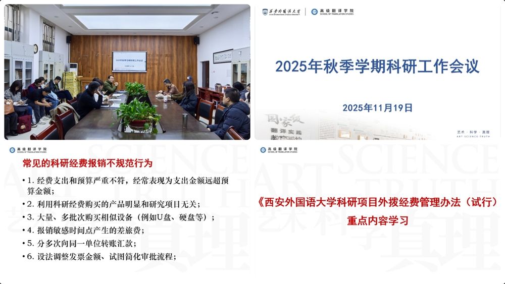 会议聚焦高级别项目申报、年度科研成果总结、经费规范化管理等议题,部署了2026年度国家社会科学基金、国家自然科学基金、教育部人文社科项目等高级别项目的重要申报节点与注意事项,围绕项目、论文、著作、获奖等四个维度总结了本年度工作成效,剖析了亮点成就及不足之处。会上学习了学校科研项目外拨经费管理办法(试行)、常见的科研经费报销不规范行为。