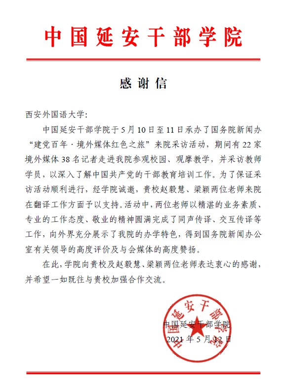 12日,中国延安干部学院向我校致感谢信,对我校及两位教师对活动的支持表示衷心感谢,指出两位教师以精湛的业务素质、专业的工作态度、敬业的精神圆满完成工作,获得国新办有关领导的高度评价及与会媒体的高度赞扬。