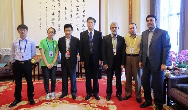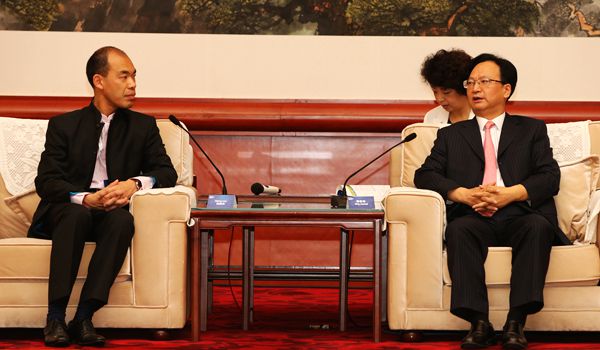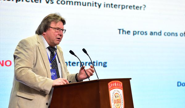 刘育红教授(右后)为中宣部副部长景俊海、国际翻译家联盟主席刘崇杰担任翻译