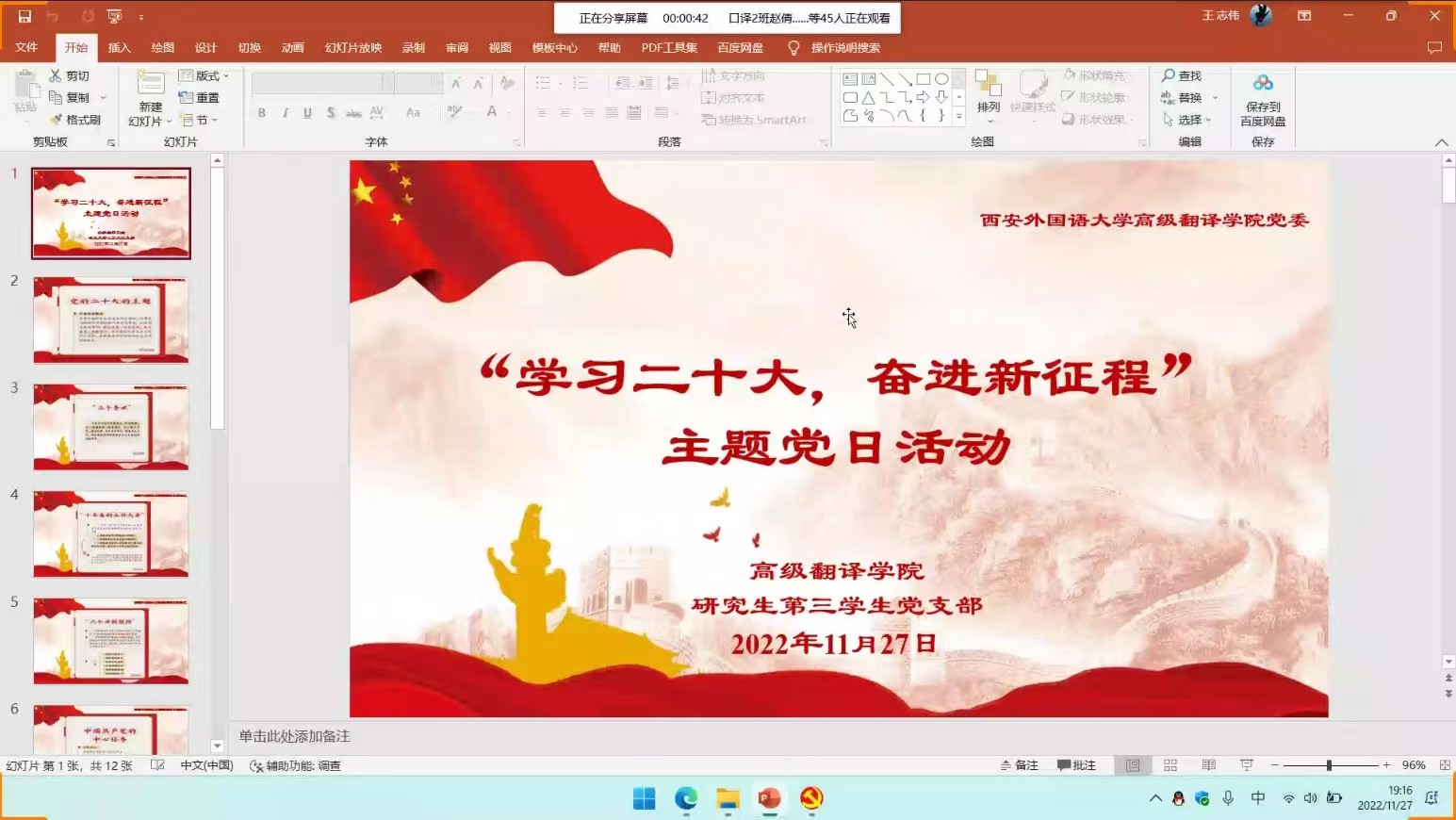分党委研究生第三学生党支部举办“学习二十大,奋进新征程”主题党日活动,支部组织委员王志伟主持活动,全体党员参加活动。