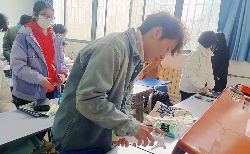 各班分别组织学生打扫教室、图书馆等场地,帮助环卫人员捡拾散落的垃圾,提醒其他学生注意维护校园干净整洁。