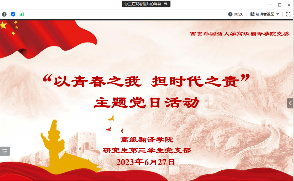分党委研究生第三学生党支部于2023年6月27日举办“以青春之我 担时代之责”主题党日活动。支部书记王欢主持活动,全体党员参加活动。