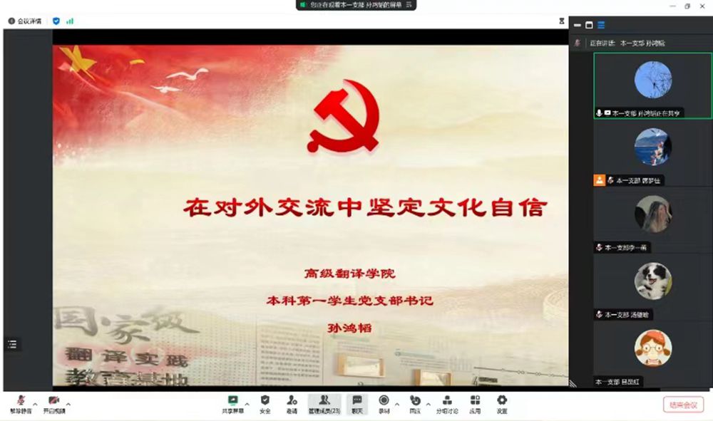 分党委本科生第一学生党支部开展“党支部书记讲党课”活动,支部书记孙鸿韬讲授题为“在对外文化交流中坚定文化自信”的党课。支部全体党员参加。