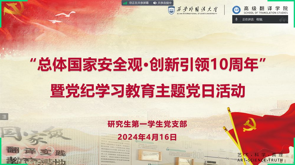 分党委研究生第一学生党支部开展国家安全与党纪学习教育主题党日活动。支部全体党员参加,支部副书记彭小玉主持活动,院党委委员李向东应邀参会指导。