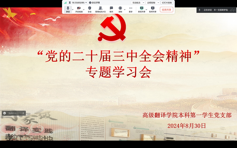 分党委本科生第一学生党支部召开理论学习会,专题学习党的二十届三中全会精神。支部全体党员、入党积极分子代表参加,支部副书记席梦佳主持会议。