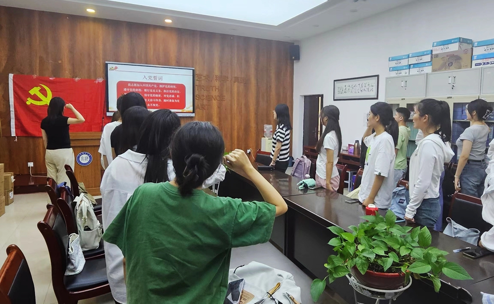 会议最后,全体党员在苗朔菡的带领下面向党旗举起右拳,重温了入党誓词。