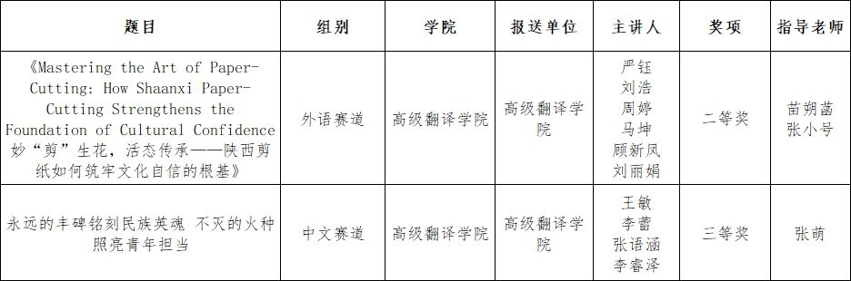 学生团队表现突出,外语赛道作品《Mastering the Art of Paper-Cutting: How Shaanxi Paper-Cutting Strengthens the Foundation of Cultural Confidence(妙 “剪” 生花,活态传承——陕西剪纸如何筑牢文化自信的根基)》获二等奖,中文赛道作品《永远的丰碑铭刻民族英魂 不灭的火种照亮青年担当》获三等奖。