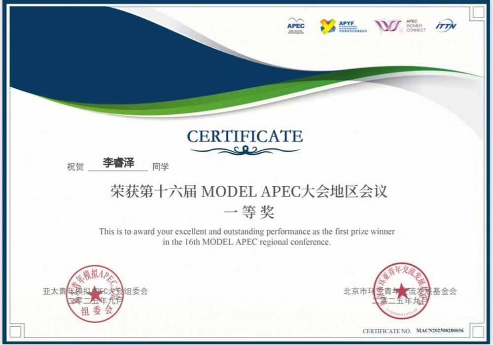 2025年8月23-27日,第十六届MODEL APEC大会地区会议举行,来自数十所高校的136名选手参赛。米兰体育官网 2023级本科生李睿泽、丁艺洋分获一等奖、二等奖。