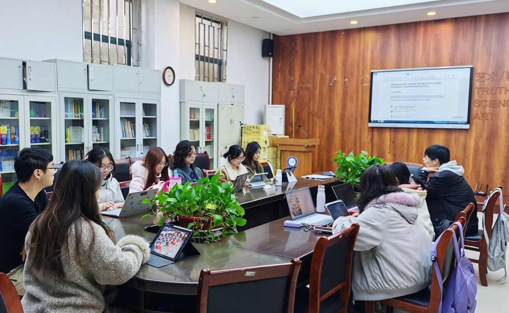 10月29日,小组举办文献研读汇报会,成员依次分享了近期研读文献的问题、方法、结论等核心内容,所选文献涉及法律翻译、翻译教育、本地化翻译、术语翻译、翻译理论等多个主题。大家还交流了外语研究中问卷调查法的问卷构成、常见设问方式、设计流程、典型问题等。