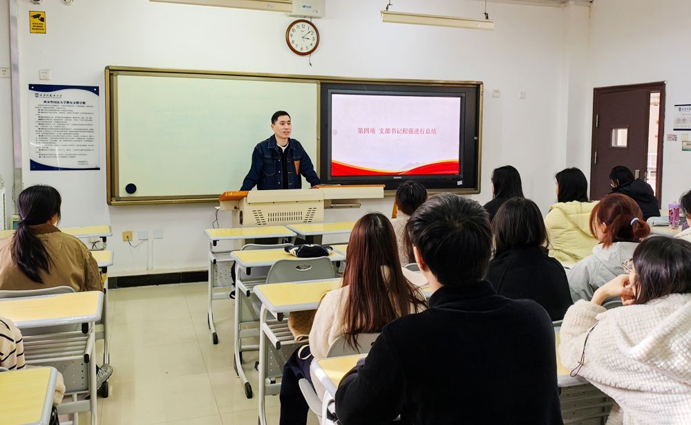 支部书记程强在发言中提出四点要求:一要深刻领会全会精神,筑牢思想根基,用好专业本领讲好中国故事;二要严肃支部纪律,确保组织生活规范有序;三要发挥党员在学业、品德、服务上的先锋模范作用;四要规范网络言行,维护清朗空间。他号召全体党员共同努力,将支部建设成为坚强的战斗堡垒,立足学院特色与优势,将学习成果转化为强大的学习动力与实践效能,在未来的学习和工作中锐意进取,追求卓越。