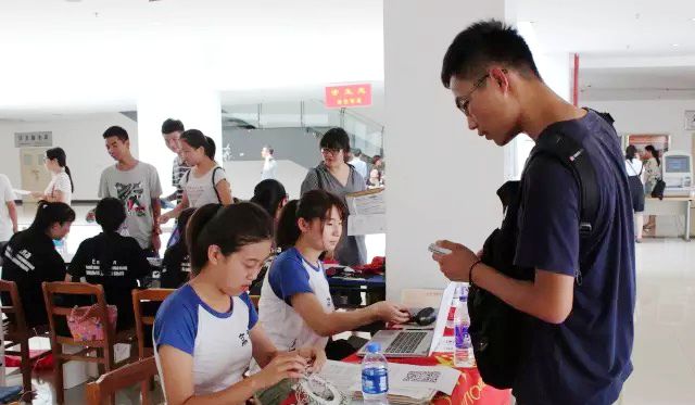 在校门内设有接待点,新生首先领取相关材料,然后在值班学生的指引下到图书馆一楼大厅进行数字化报名。新生大多由父母陪同,半数是第一次离家求学。为培养他们的独立意识,我校特地设有家长等待区,让新生自主完成报到手续,尽快适应新生活。