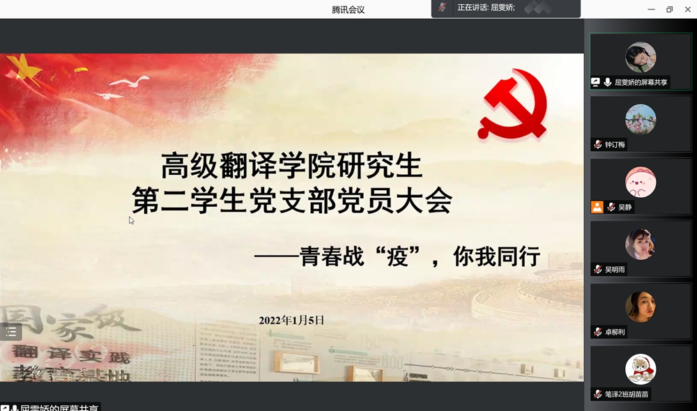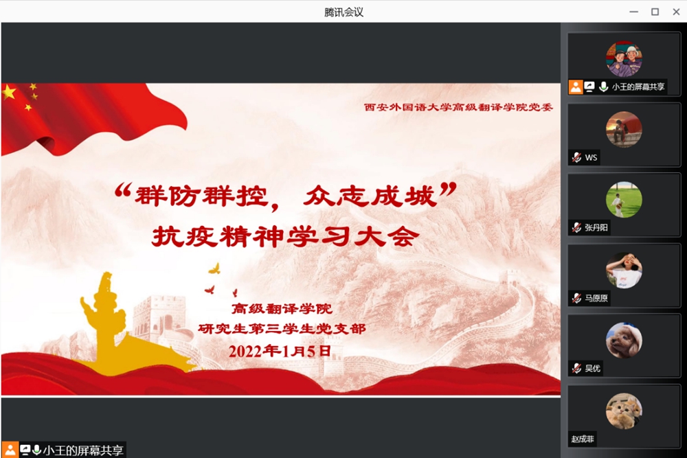 研究生第三学生党支部开展了“群防群控,众志成城”抗疫精神学习大会。组织委员王志伟播放了国家卫生健康委主任马晓伟调研指导我校2022年硕士研究生考试疫情防控工作的有关视频,带领全体党员学习了疫情期间我校党员先锋队、学生志愿者以及优秀校友的感人事迹。王梦薇、温帅、邓涵涌、毛佳蔚等人分享了自己作为志愿者的抗疫经历。支部副书记侯琪玥对所有参与志愿者工作的同学表示感谢,希望全体党员在疫情防控的关键时期起到先锋模范作用,带头配合疫情防控工作。
