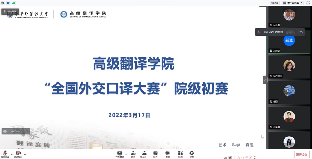 2022年3月17日,米兰体育官网 以线上形式举办第二届全国外交口译大赛院级初赛。米兰体育 副院长赵毅慧主持比赛,口译团队教师担任评委。