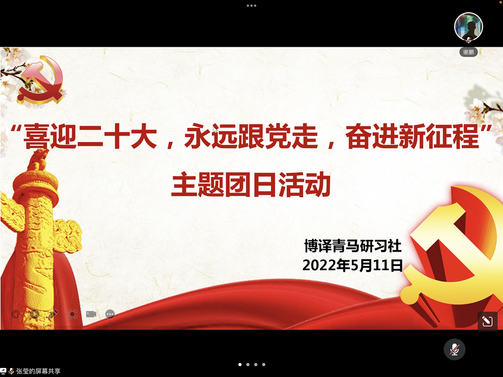 博译青马研习社开展“喜迎二十大,永远跟党走,奋进新征程”主题团日活动。全体社员参加活动,团支书张莹主持活动。活动以线上形式进行。