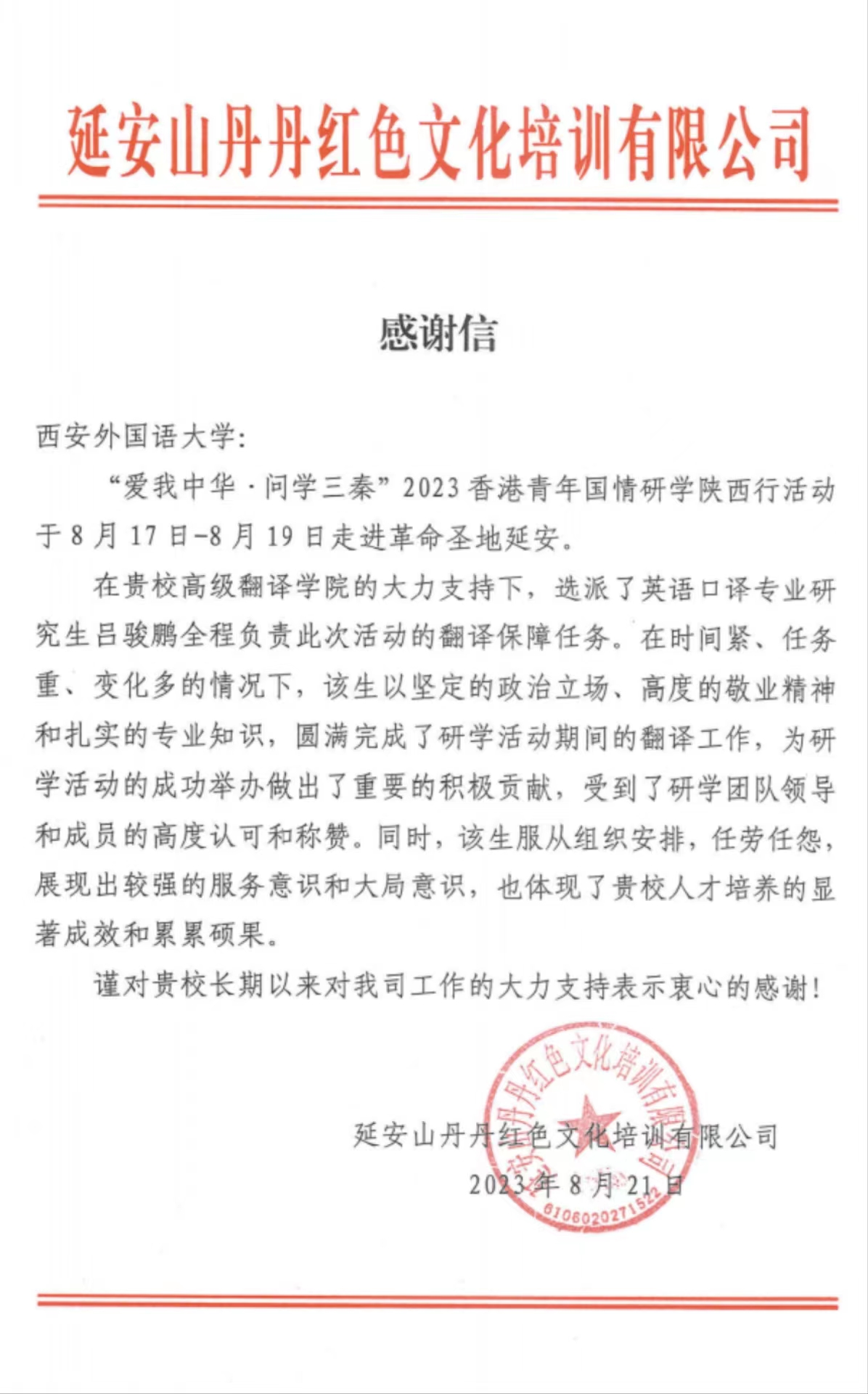 研学团先后参访了黄帝陵、延安革命纪念馆、延安大学等地。吕骏鹏负责了“黄帝精神的基本内涵与时代价值”现场教学翻译、延安革命纪念馆讲解翻译、延安大学关于延安精神及其时代价值的教学翻译等。在时间紧、任务重的情况下,吕骏鹏以坚定的政治立场、高度的敬业精神、扎实的专业基础、精湛的业务水平圆满完成工作,为研学活动的成功举办做出了积极贡献,受到了香港培侨中学师生和研学团队领导的高度称赞和衷心感谢。